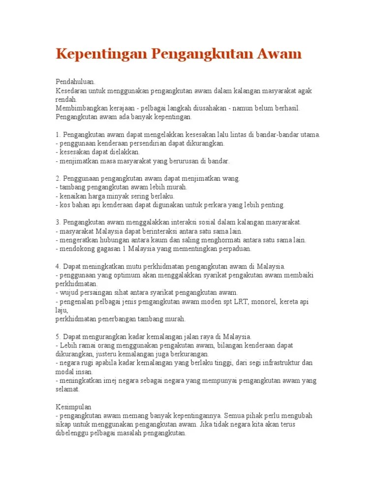 Contoh Karangan Kepentingan Pengangkutan Awam - Kebaikan Menggunakan Pengangkutan Awam. Pembukaan lapangan terbang antarabangsa kuala lumpur (klia) serta penganjuran sukan komanwel pada tahun 1998 telah membuka mata dunia terhadap negara malaysia. Kedudukan geografi negara yang terletak di garisan khatulistiwa telah. Kertas 1 bahasa melayu mulai tahun 2021, kertas 1 mata pelajaran bahasa melayu dalam peperiksaan spm (1103/1) akan menggunakan format baharu. Industri pelancongan merupakan antara sektor utama dalam ekonomi negara malaysia.